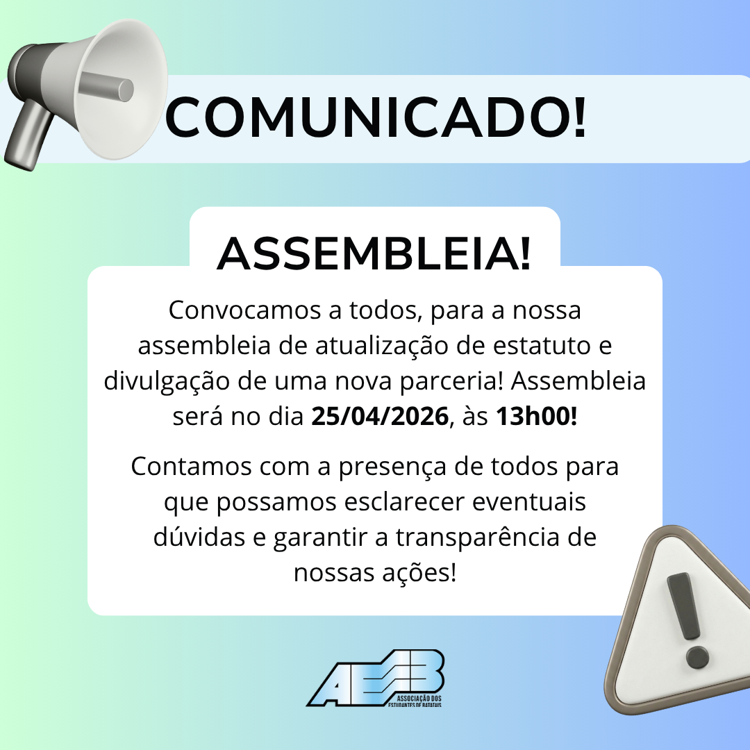 Informamos a todos que nossa assembleia do dia 25/04/2026 foi alterada para o dia 02/05/2026, às 13h00, no mesmo local.
