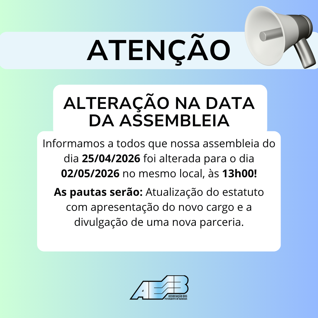 Alteração da data da nossa assembleia do dia 25/04/2026 foi alterada para o dia 02/05/2026, às 13h00!